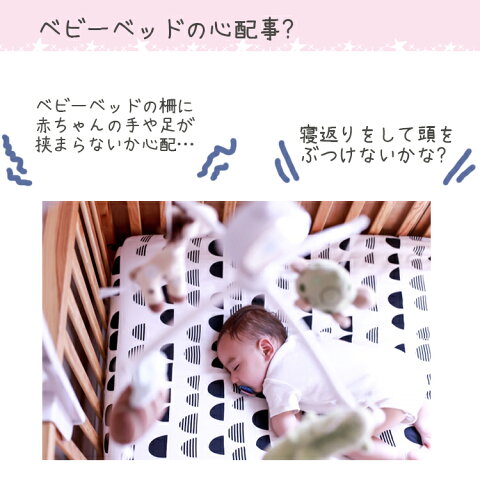 ベビーベッド派のママも、添い寝派のママも、 ベビーをぐるっと囲って安全にねんねさせましょう! …こんな心配はありませんか? ベビーベッドの柵に赤ちゃんの手足が挟まるのを防止したい 寝返りしたとき、頭をぶつけないか心配。